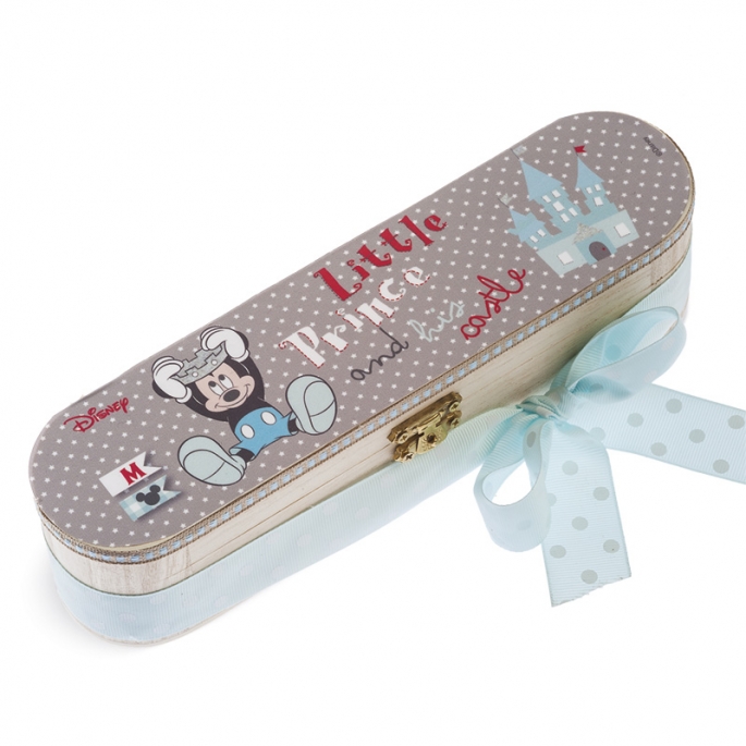 Disney ξύλινη natural κασετίνα με μεταλλικό κούμπωμα . Είναι διακοσμημένη με αυτοκόλλητο print Mickey mouse " Little prince in his castle" σε σιέλ αποχρώσεις.