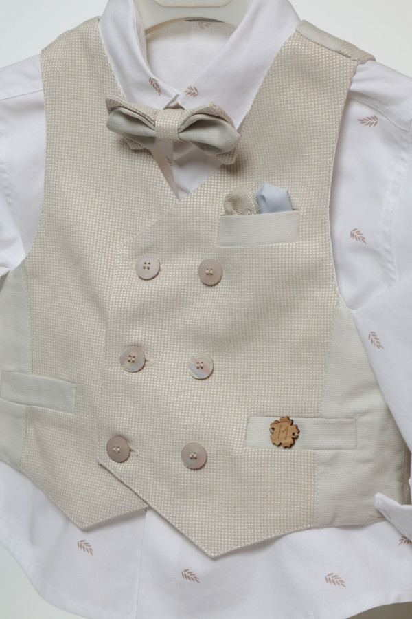 Βαπτιστικό κουστουμάκι οικονομικό σετ βαμβακερό της Mi Chiamo σε λευκές/μπεζ αποχρώσεις. Περιλαμβάνει βαμβακερό παντελόνι σε ίσια κλασσική γραμμή με ζώνη και διακοσμητικό κομπολόϊ, βαμβακερό πουκάμισο με μικροσχέδια, γιλέκο σε σχέδιο σταυροκούμπι με 6 κουμπιά, τσέπες φιλέτα, ριγέ φακαρόλα και διακοσμητικό logo τριφύλλι, παπιγιόν ασορτί μπεζ και λευκό ψάθινο καπέλο στυλ καβουράκι.