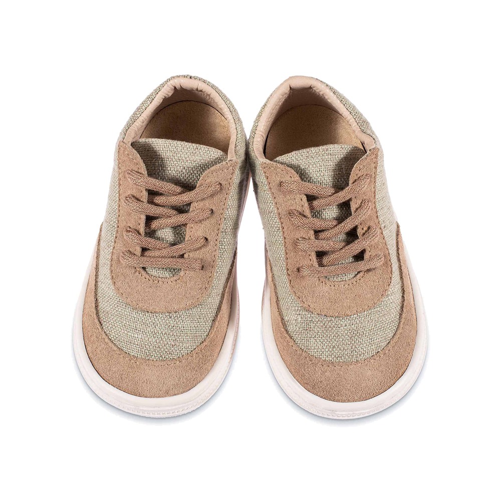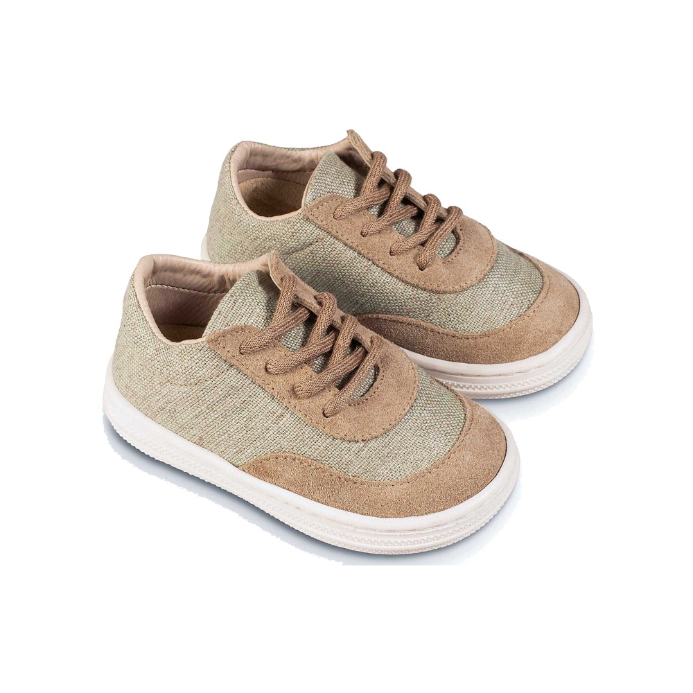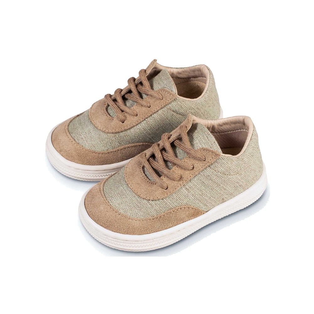 Τα παπουτσάκια ενός παιδιού δεν αρκεί να ικανοποιούν μόνο την αισθητική, αλλά πρέπει να έχουν συγκεκριμένες προδιαγραφές άνεσης, ποιότητας και λειτουργικότητας. Το πόδι ενός παιδιού είναι ακόμα αφορμάριστο και έχει τις ιδιαιτερότητες του. Γι' αυτό χρειάζεται προστασία και φροντίδα για τη σωστή ανάπτυξη του.Δετό δίχρωμο σνίκερ από ύφασμα και δέρμα, σε μπεζ- φυστικί χρώμα. Πριν ολοκληρώσετε την παραγγελία σας, συμβουλευτείτε το μεγεθολόγιο
