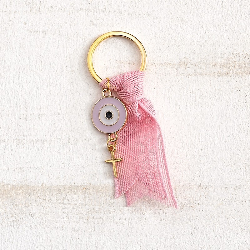 Μαρτυρικό μπρελόκ χρυσό με κορδέλα γάζας ροζ,μάτι στρογγυλό ροζ και επίχρυσο σταυρουδάκι