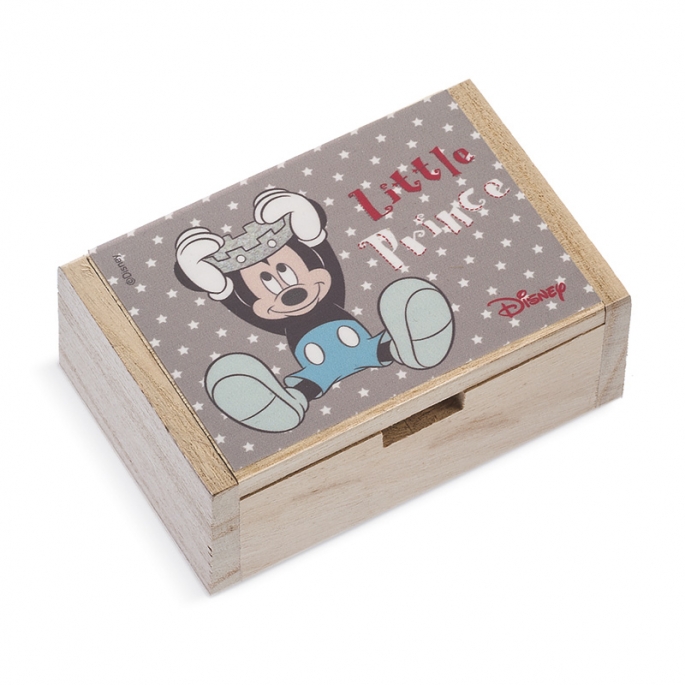 Disney ξύλινο natural παραλληλόγραμο κουτί . Είναι διακοσμημένο με αυτοκόλλητο print Mickey mouse " Little prince in his castle" σε σιέλ αποχρώσεις.