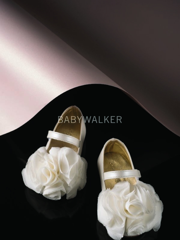 Βαπτιστικά παπούτσια για κορίτσια δερμάτινο γοβάκι με μεγάλο chiffon λουλούδι ανατομικά από δέρμα πέρλα.