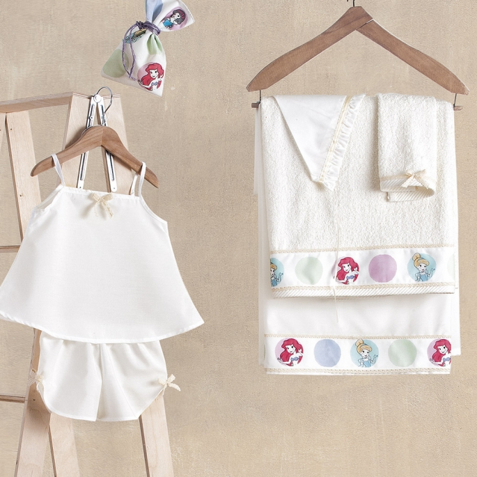 Disney σετ λαδόπανα βάπτισης σε εκρού χρώμα με σχέδιο τις πριγκίπισσες της Disney.Στο σετ περιλαμβάνεται το λαδόπανο,τα εσώρουχα,η πετσέτα η μεγάλη και η μικρή των χεριών