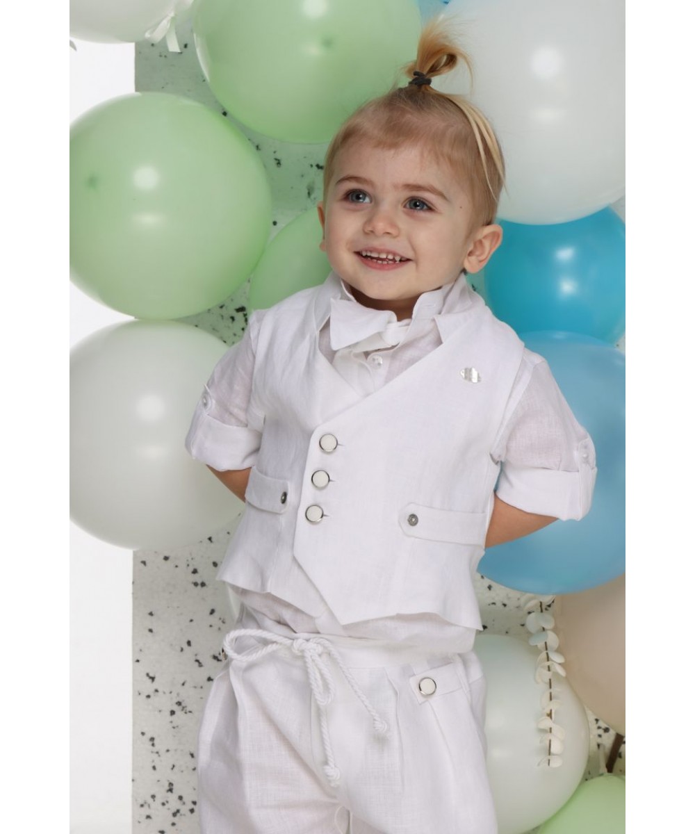 Το σετ αποτελείται από λευκό πουκάμισο, γιλέκο και παντελόνι.