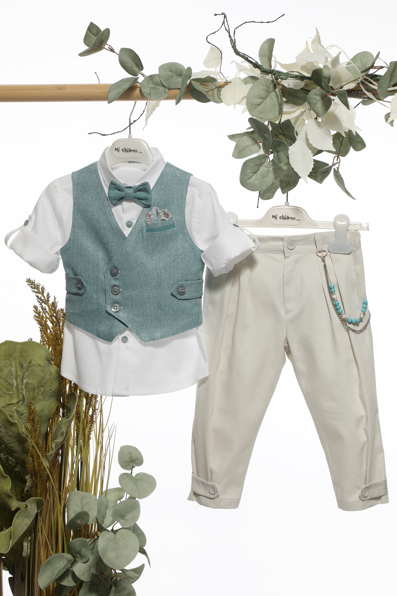 Αποτελείται απο παντελόνι στο χρώμα του πάγου, λευκό πουκάμισο, οινοπνευματί γιλέκο, παπιγιόν και ψάθινο καπέλο καβουράκι!