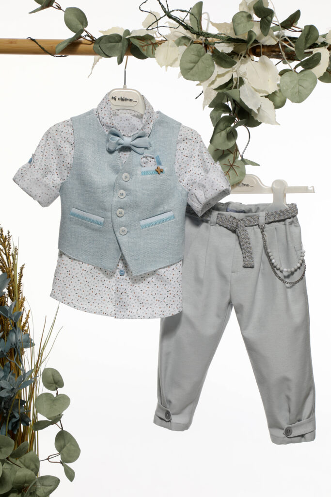 Αποτελείται από σιελ ανοιχτό παντελόνι, λευκό πουκάμισο, γκρι γιλέκο, ζώνη, παπιγιόν και ψάθινο καπέλο καβουράκι!