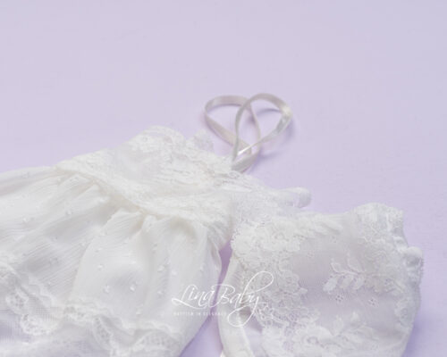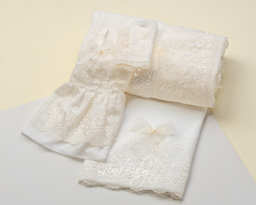 Λαδόπανο σε λευκό & εκρού  χρώμα με Γαλλική δαντέλα εξαιρετικής ποιότητας  και  εσώρουχα από  δαντέλα και μουσελίνα.