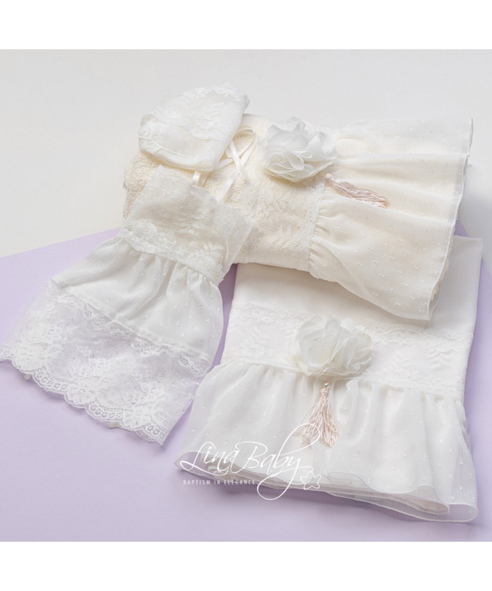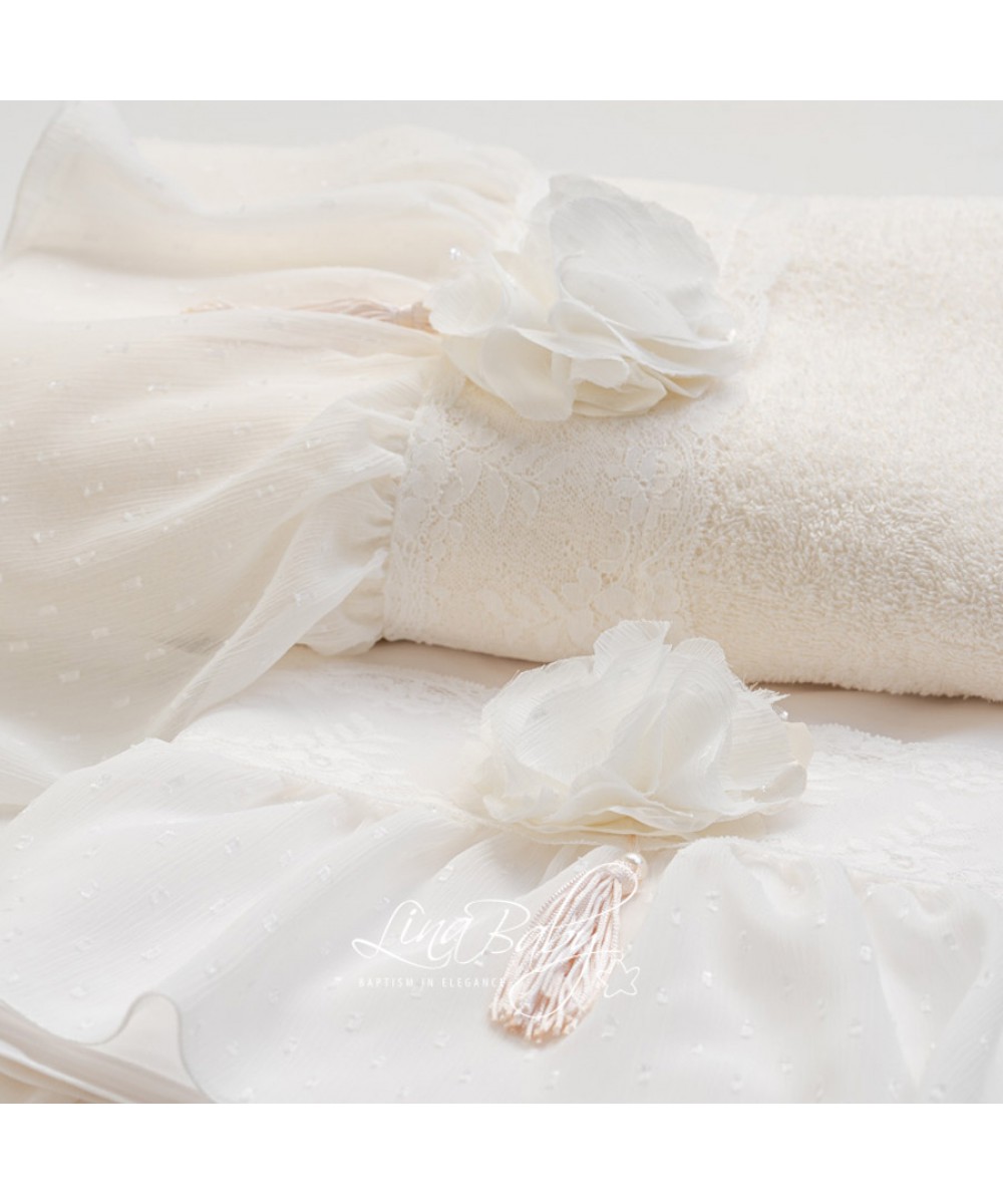 Βαμβακερό σετ λαδόπανου σε εκρού χρώμα, ένα μοναδικό λαδόπανο από ύφασμα πουά μουσελίνα, διακοσμητική φάσα δαντέλας, απλικέ χειροποίητο λουλούδι, πέρλες και φουντίτσα. Προσφέρεται η δυνατότητα γραφής του ονόματος του παιδιού: