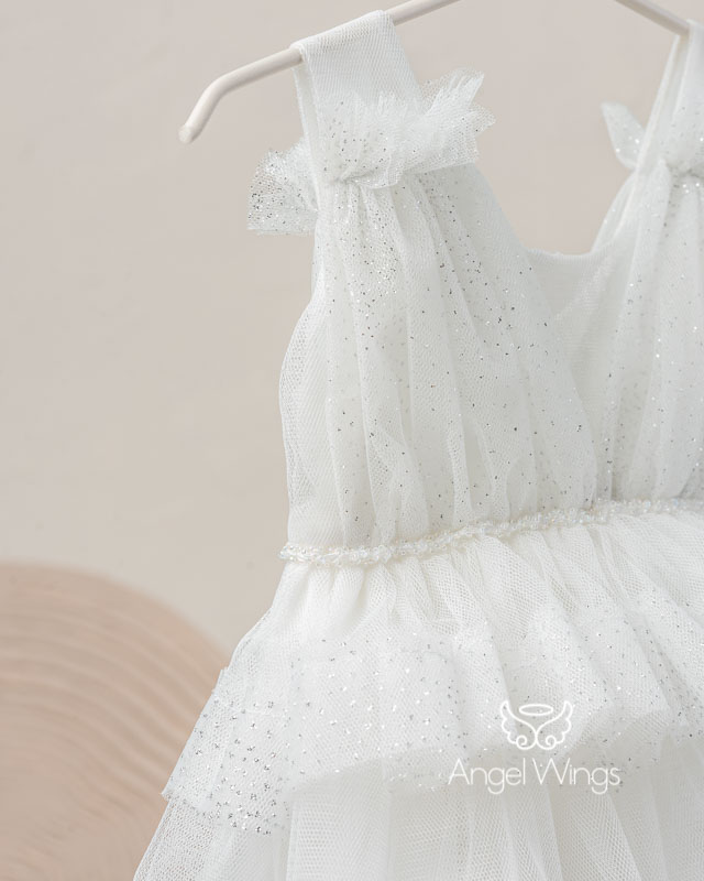 Ένα τούλινο φόρεμα σε χρώμα off white με μπούστο ντραπαριστό μπροστά και πίσω από γκλίτερ ασημί τούλι και πλούσια φούστα που αποτελείται από 3 σειρές βολάν και σούρα.